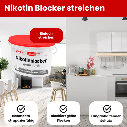 Neben der Blockierung von Nikotin und Teer sorgt der Nikotinblocker auch dafür, dass die neue Farbe besser haftet und die Wände länger frisch bleiben. Du kannst den Nikotinblocker sowohl in Raucherwohnungen als auch in anderen stark belasteten Räumen verwenden, wie zum Beispiel in Küchen, in denen viel gekocht wird und Fettablagerungen an den Wänden haften.