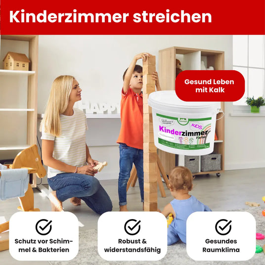 Perfekt fürs Kinderzimmer, da die Farbe atmungsaktiv ist und die Luftfeuchtigkeit reguliert.